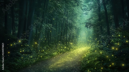 Obraz premium Walking Through Enchanted Woods at Night Surrounded by Fireflies Under...