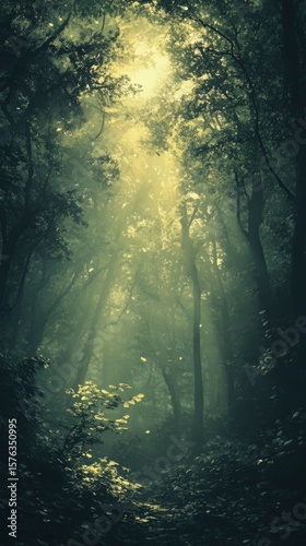 Obraz premium Walking Through Forest with Sun Rays and Mist