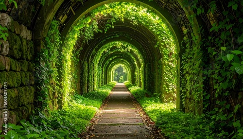 Fototapeta premium Walking Through Lush Green Arched Tunnel Path