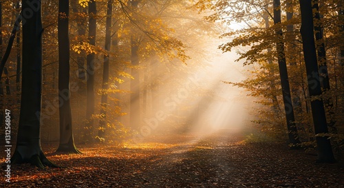 © BADRUN, Obraz premium Walking Through Sunlight in Autumn Forest with Colorful Leaves