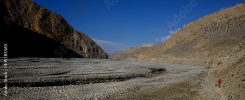 © Iwona, Fototapeta premium Walking tourist in riverbed of the Kali Gandaki River in amazing land of Mustang in the Himalaya in Nepal, near Jomson. This is the deepest valley in the world. During Annapurna Circuit trekking.
