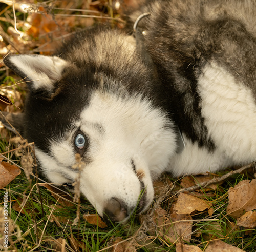 © sergo321, Fototapeta premium Walking with your favorite husky dogs in the park in autumn. Autumn walk in the park with your dog.
