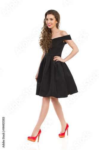 Fototapeta premium Walking Woman In Black Cocktail Dress ANd High Heels