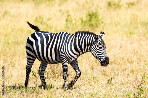 Naklejka premium Walking zebra in African savannah. Masai Mara National park, Kenya