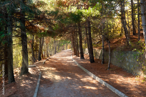 Naklejka premium Walkroad in pine forest with sun beams at Crimea mountains