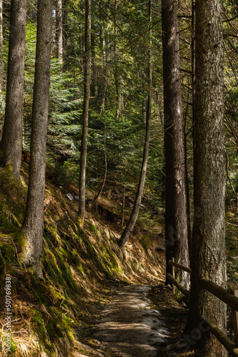Fototapeta premium Walkway between evergreen trees and moss on hill in forest.