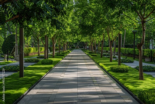 Obraz premium Walkway in the park with green grass and trees in summer.