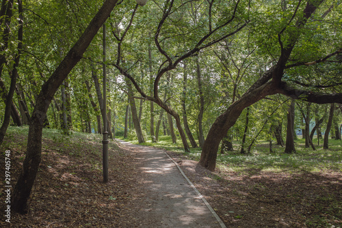 © alexey351, Naklejka premium Walkway in the park with green trees. Beautiful landscape of summer forest.