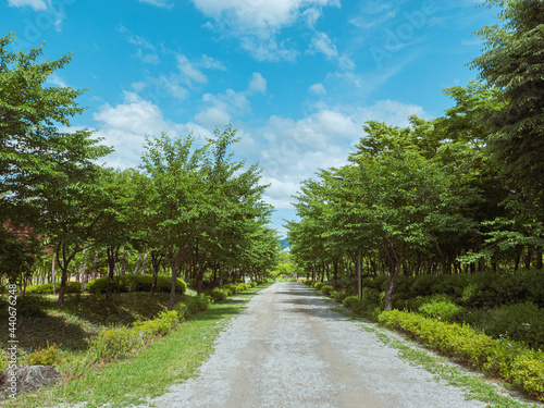 © SHIMSNAG'S, Fototapeta premium Walkway Lane Path With Green Trees in Forest.