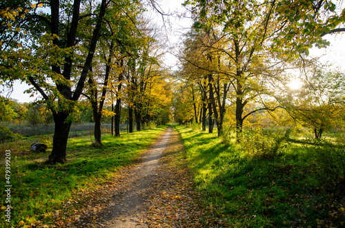 Naklejka premium Walkway Lane Path With Green Trees in Forest. Beautiful Alley In Park....