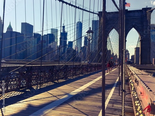 © Spinel, Obraz premium Walkway of Brooklyn bridge and buildings at Manhattan in vintage style, New York