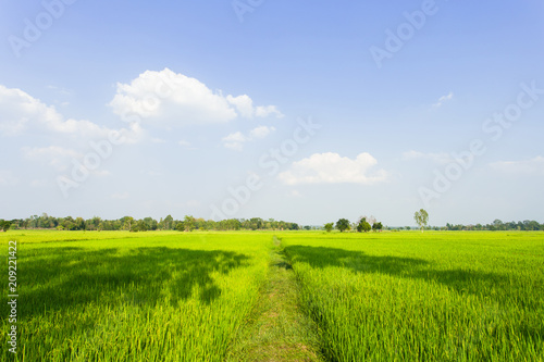 © sichon, Fototapeta premium Walkway of rice field green grass and blue sky. Rice green farmer's farm. Scenic view of the landscape paddy field at thailand