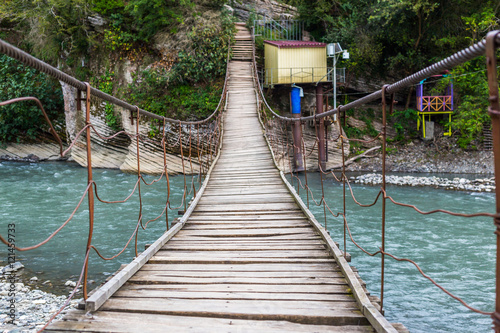 © tatyun, Obraz premium Walkway old wooden footbridge in summer forest