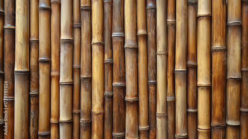 Fototapeta premium Wall made of natural bamboo stems arranged in vertical alignment, symbolizing strength, sustainability, resilience, harmony with nature, and eco-friendly design.