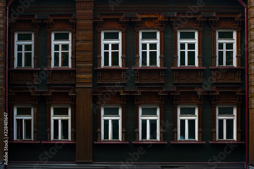 © Alina Utkina, Obraz premium wall of brown wooden house with white windows