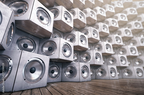 © ilya_levchenko, Obraz premium Wall of musical speakers on a wooden background. 3d Illustration