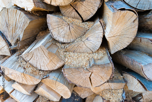 © bubutu, Naklejka premium Wall of stacked wood logs as background
