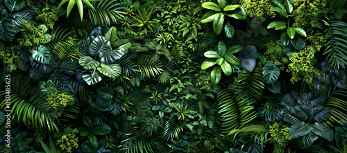 Fototapeta premium wall of tropical plants and moss, lush greenery, leaves in various shapes and sizes, some flowers scattered throughout, top view, dark background