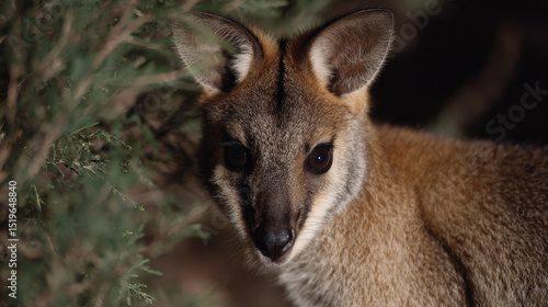 © Nittaya, Fototapeta premium Wallaby with bright eyes stands among brush in early light