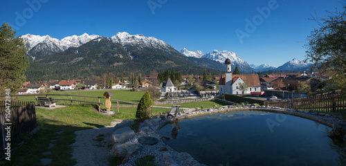 Fototapeta premium Wallgau im zeitigen Frühjahr mit schneebedeckten Gipfeln