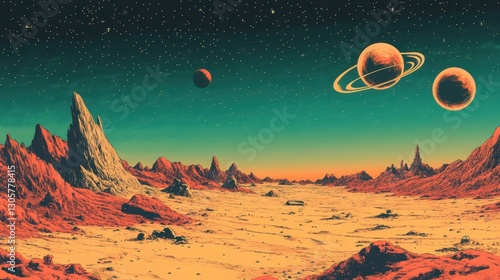 Naklejka premium Wallpaper featuring a surreal planetscape with glowing skies and vintage...