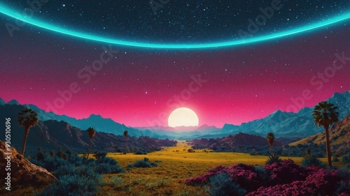 © Damian Sobczyk, Fototapeta premium Wallpaper in pop style, the desert combines with the mountains and the sun over them