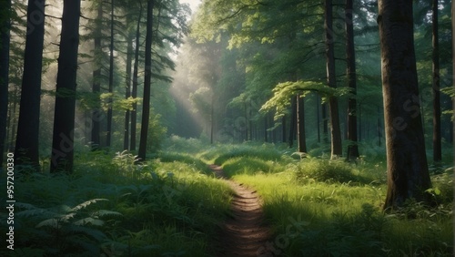 © Karolina, Fototapeta premium Wallpaper natural summer forest and sun rays penetrating through trees