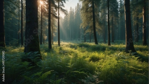 Fototapeta premium Wallpaper natural summer forest and sun rays penetrating through trees