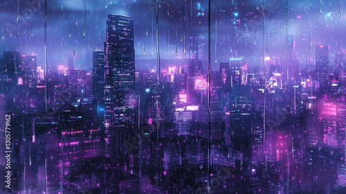 © javier, Fototapeta premium Wallpaper with raindrops falling against neon city lights vintage ink textures with pastel glows blending into the skyline