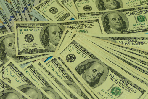 © KievBest, Fototapeta premium Wallpaper with the banknotes of one hundred or fifty dollars