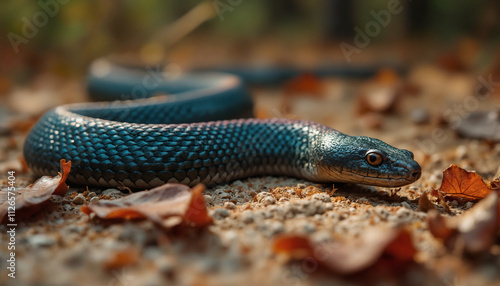 Fototapeta premium wallpapers A stunning blue snake slithers gracefully over a bed of autumn...