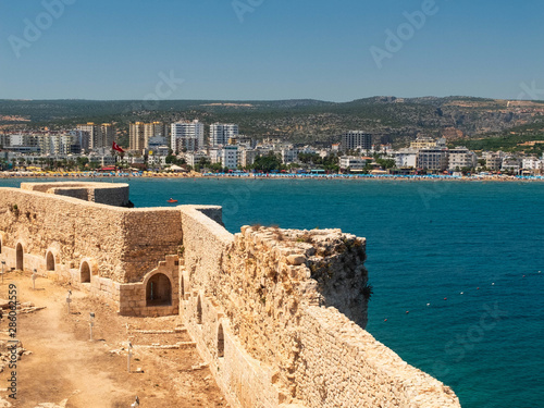 Fototapeta premium Walls of Maiden's castle or Kizkalesi or Deniz kalesi and view of sea and Kizkalesi town, Mersin province, Turkey