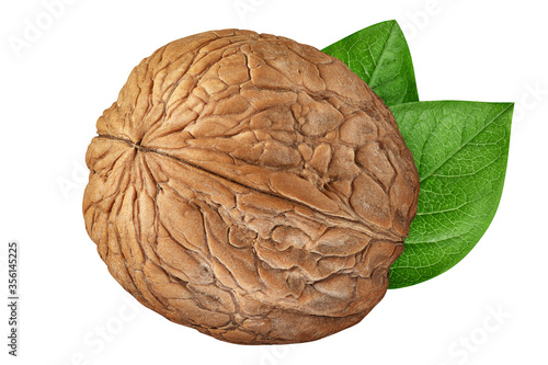 Obraz premium Walnut isolated on white background. One walnut closeup with green leaves. Nut organic