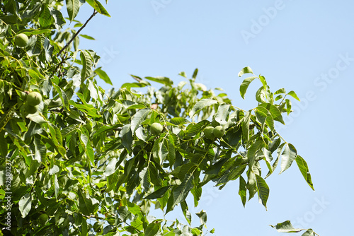 © mikeosphoto, Obraz premium Walnut tree with walnut fruit in green pericarp