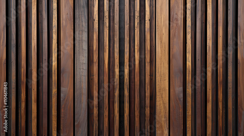 Naklejka premium Walnut Wood Paneling: A sleek and contemporary wood paneling design, featuring narrow vertical strips of rich walnut wood arranged in a regular pattern.