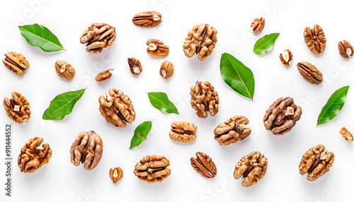 © Oleksiy, Obraz premium Walnuts with leaf isolated on white background. Top view. Flat lay