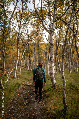 © Victoria, Fototapeta premium Wanderer im hellen Birkenwald bei Tageslicht