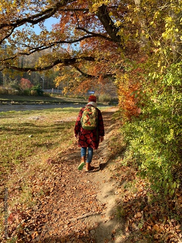 © hachri, Obraz premium Wanderer im Herbstwald am Fluss Sihl unter bunten Herbstbäume