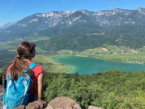 Naklejka premium Wanderin mit Rucksack mit Blick zum Kalterer See