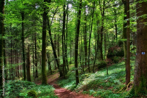 © ansi29, Naklejka premium Wandern auf Wanderwegen im Wald