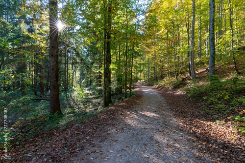 Fototapeta premium Wanderweg am Langbathsee mit vielen Laubbäumen im Herbst