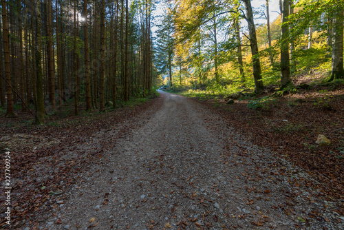 Fototapeta premium Wanderweg am Langbathsee mit vielen Laubbäumen im Herbst