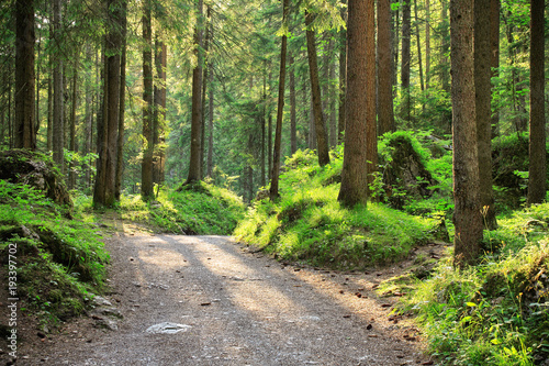 © AVTG, Fototapeta premium Wanderweg durch sonnigen Fichtenwald