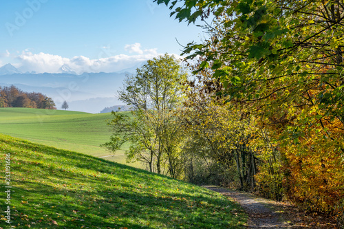 Fototapeta premium Wanderweg entlang eines Feldes mit Blick auf die nebelverhangenen Schweizer Alpen
