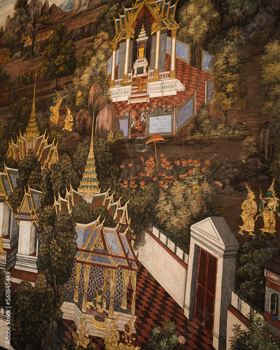 © Con, Fototapeta premium Wandmalerei des alten buddhistischen Tempels, des Lebens von Buddha, im Wat Pho in Bangkok, Thailand