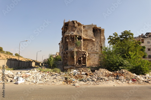 Naklejka premium War damaged building in Aleppo, Syria, showing destruction from heavy...