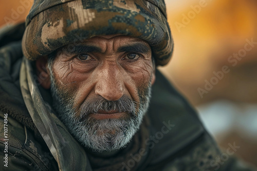 © Marco Attano, Fototapeta premium war journalist, worn-out expression, background of a blurred war-torn landscape