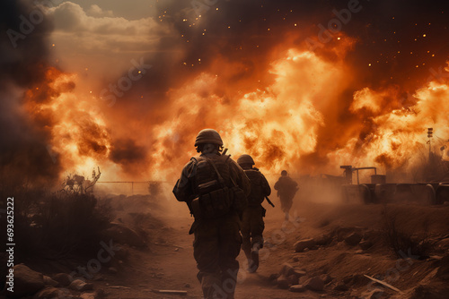 Naklejka premium War Zone: Soldiers Facing Explosions and Fire