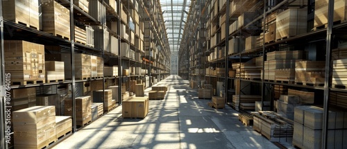 © MOMO, Fototapeta premium Warehouse aisle filled with stacked boxes and pallets.