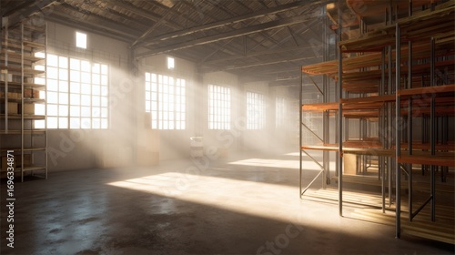 Fototapeta premium warehouse. An expansive warehouse with atmospheric light beams highlighting...